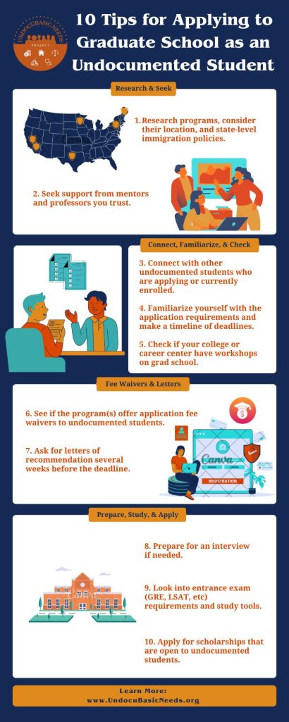 In your search for graduate school options, you may encounter programs, for example, that very clearly take into account the California State Dream Act (AB 130 and AB 131) when factoring in your financial aid for graduate studies. Alternatively, you may encounter graduate school programs that believe such policies are limited to undergraduates only. As you navigate the graduate school application process, it is imperative to stay informed about specific state policies, legal protections, and resources available within your specific university and state of residence. It is also helpful to connect with fellow undocumented students who are currently in graduate school or who have successfully graduated to learn about their experiences and advice.