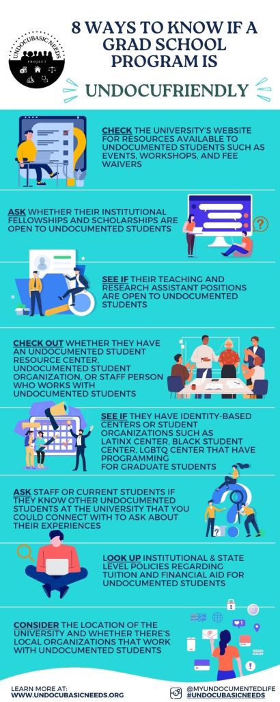 - Cost. Make sure to consider the cost of attending graduate school, including tuition, health insurance, housing, and other expenses. It is also important to check whether the school provides in-state tuition or state financial aid for undocumented graduate students as well. (More information on how to pay for graduate school below).